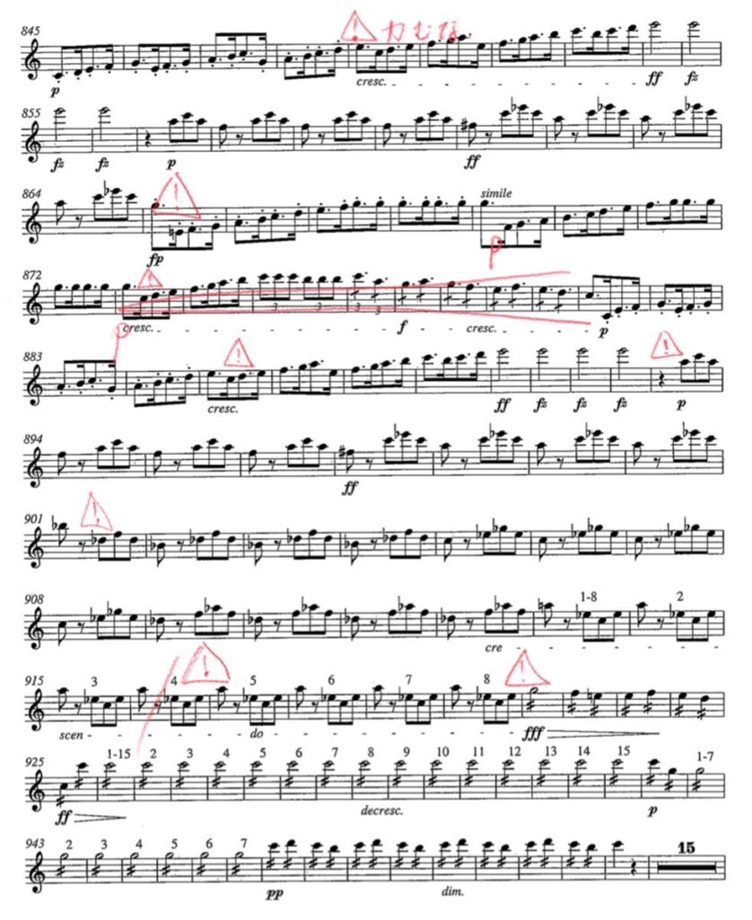 921のfffが開放的にならないのはその前の長いクレッシェンドを力で処理しようとしているからかもしれない。さらに前の897から音程に不安があるせいで921までを見通せていないからかもしれない。それは895のpに落とすために体が硬直するせいかもしれない。それは体と頭に余裕がないまま889に入っているせいかもしれない。と、曲の頭まで遡れてしまいそう。